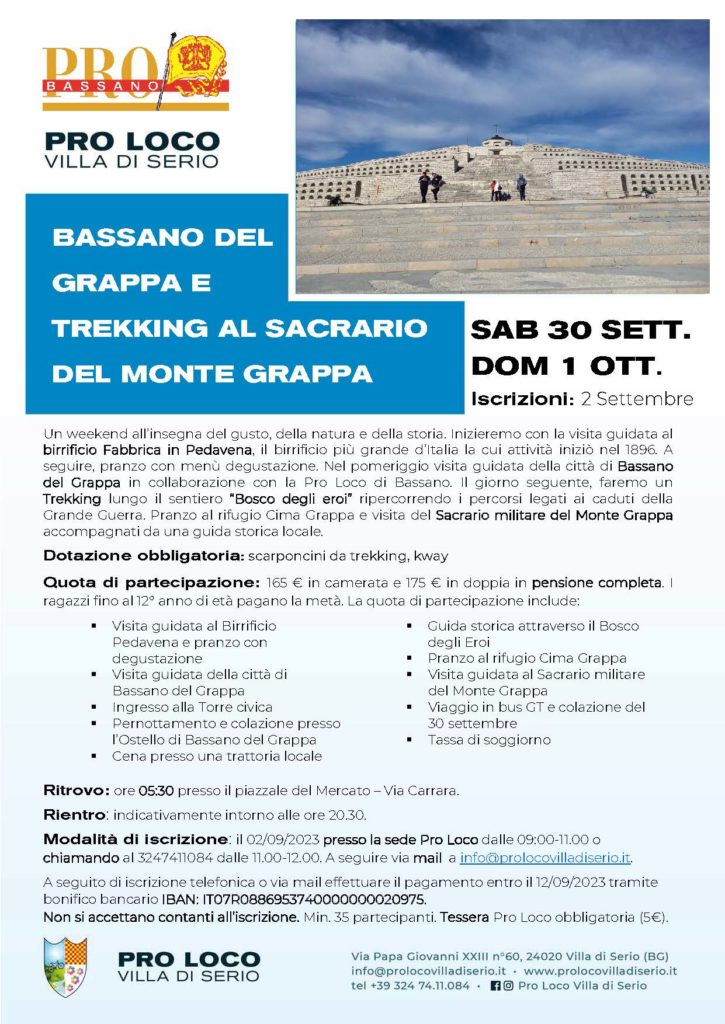 Bassano del Grappa e trekking al Sacrario del Monte Grappa Calendario Aggiungi al Calendario Aggiunti al Calendario di Timely Aggiungi a Google Aggiungi ad Outlook Aggiungi al Calendario Apple Aggiungi ad altro calendario Export to XML Quando: settembre 30, 2023@5:30 am–ottobre 1, 2023@8:30 pm 2023-09-30T05:30:00+02:00 2023-10-01T20:30:00+02:00 Dove: Bassano del Grappa Costo: € 165 Contatto: Pro Loco Villa di Serio 3247411084 E-mail Sito web Evento Gite Scarica il volantino