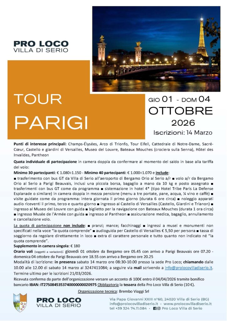 Tour Parigi Calendario Aggiungi al Calendario Aggiunti al Calendario di Timely Aggiungi a Google Aggiungi ad Outlook Aggiungi al Calendario Apple Aggiungi ad altro calendario Export to XML Quando: ottobre 1, 2026–ottobre 4, 2026 giorno intero 2026-10-01T00:00:00+02:00 2026-10-05T00:00:00+02:00 Dove: Parigi Contatto: Pro Loco Villa di Serio 3247411084 E-mail Sito web Evento Gite Tour Parigi – 2026