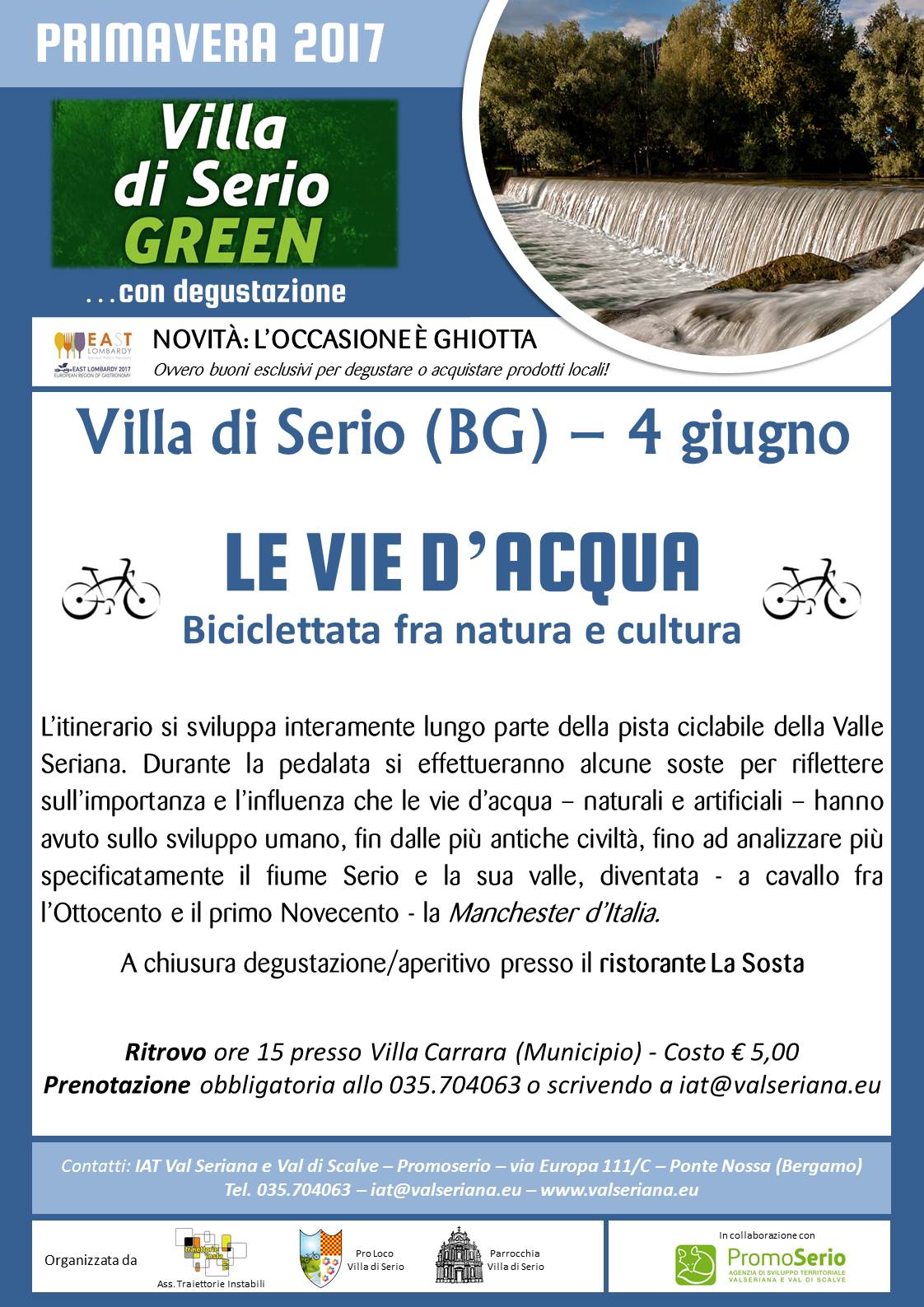Seriana. Durante la pedalata si effettueranno alcune soste per riflettere sull’importanza e l’influenza che le vie d’acqua – naturali e artificiali – hanno avuto sullo sviluppo umano, fin dalle più antiche civiltà, fino ad analizzare più specificatamente il fiume Serio e la sua valle.